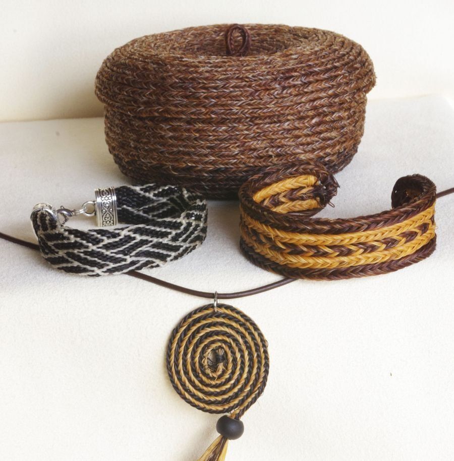 Alle hier gezeigten Objekte sind handgefertigt aus Mähnen- bzw. Schweifhaaren von Pferden. Die Haare sind selbstverständlich mehrfach gewaschen und entfettet, so dass Ihnen der typische "Stallgeruch" nicht mehr anhaftet.